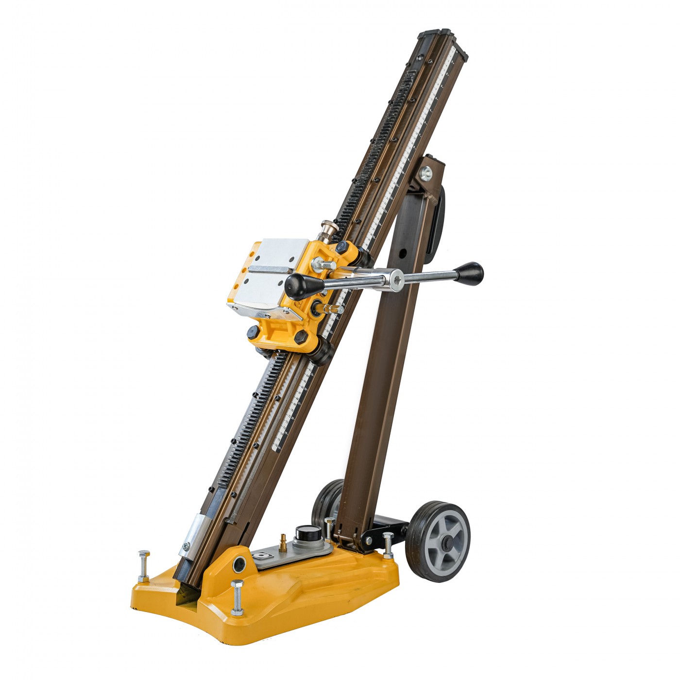 Nasz statyw cechują wymiary 575 x 260 x 945 mm przy ciężarze 20 kg, pozwalając na wygodną pracę nawet na ciaśniejszych powierzchniach. Rączka dźwigni posuwowej może być zamontowana z prawej lub lewej strony, w zależności od możliwości i preferencji użytkownika. Konstrukcję wieńczą kółka jezdne, montowane przy podstawie, znacznie ułatwiające transport.